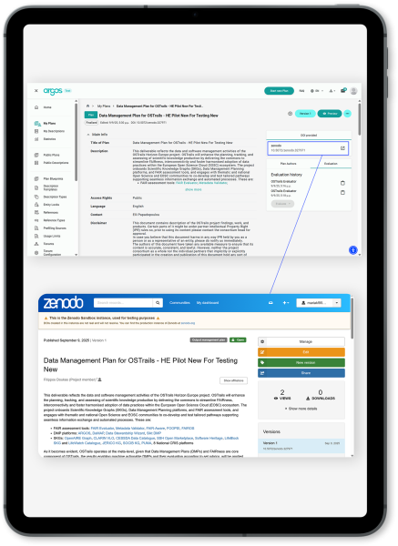 Closing the Management Lifecycle: A Plan in ARGOS is validated against FAIR principles and other set criteria, before being finalised and then published to external resources which are harvested by scientific knowledge graphs, such as the OpenAIRE Graph, supporting a 360o view of research.