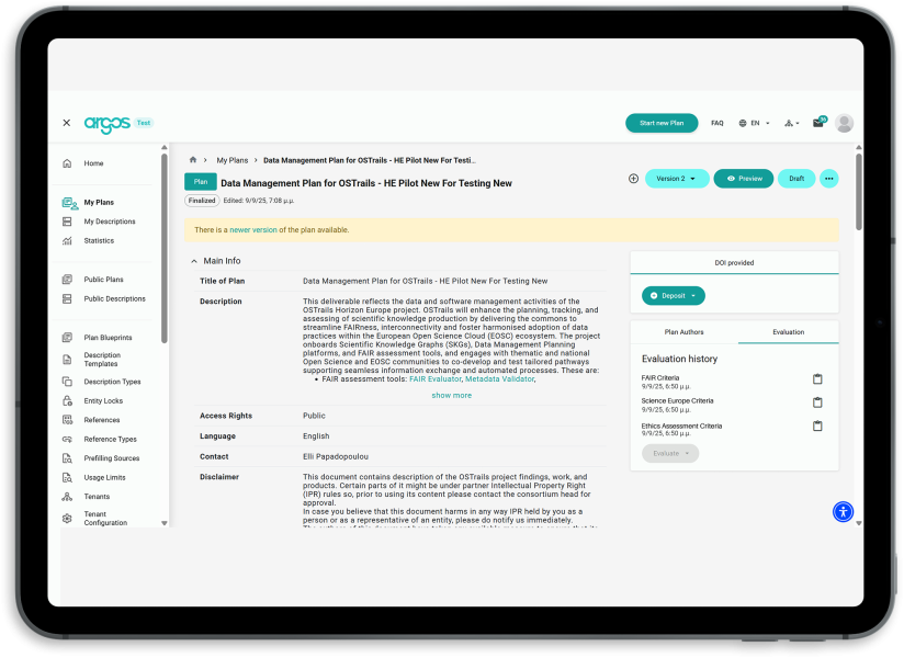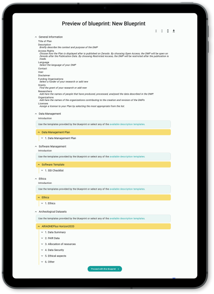 Diverse Output Overview: ARGOS enables administrators to develop Templates that guide researchers into following best practices while staying organised which they can then include in Blueprints that they create to structure Plans and connect them to administrative workflows/services for support. Researchers use these Blueprints to draft their Plans providing information about their research output activities (datasets, software and workflows, etc) which can then be reviewed by peers. Plans can be versioned at any time throughout the research lifecycle.